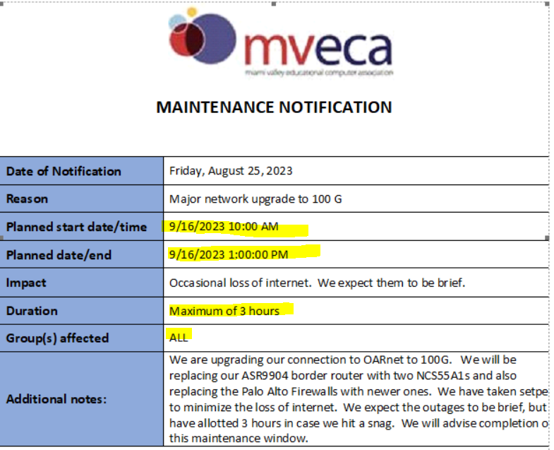 PLEASE NOTE THIS AFFECTS ALL CONNECTIONS TO MVECA!!!!