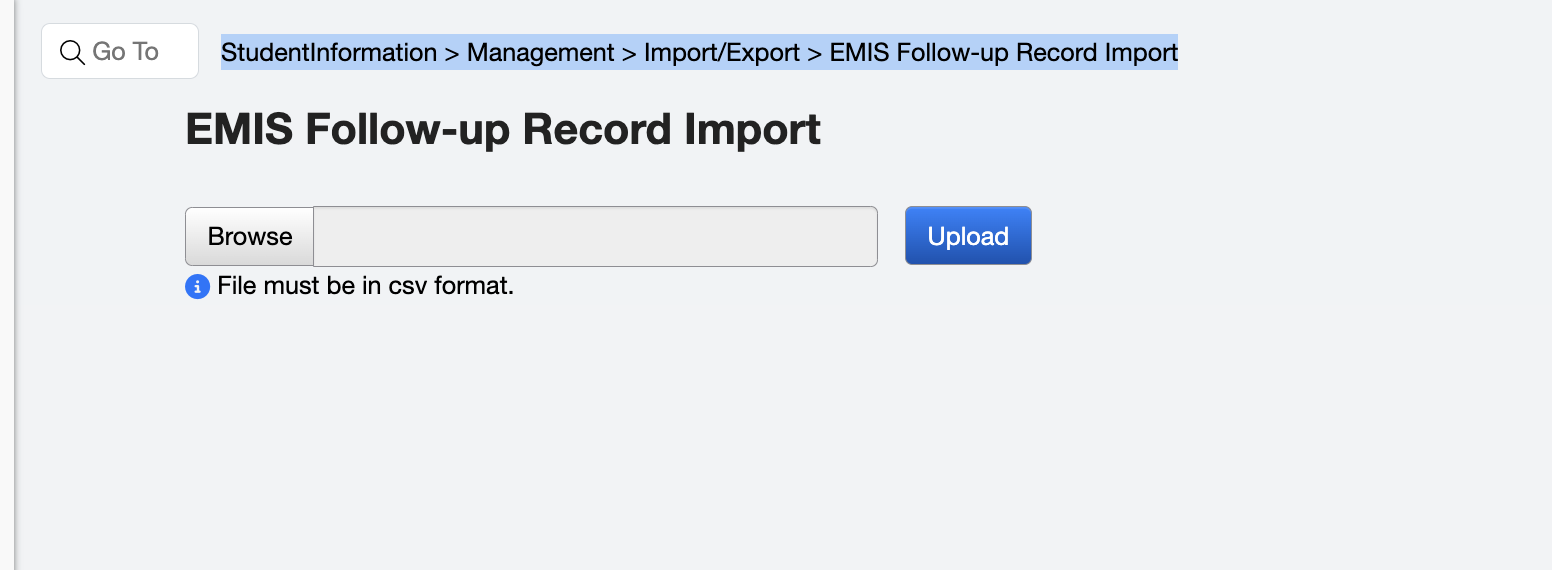 StudentInformation<https://dasl.mveca.org/dasl/Default.aspx> > Management<https://dasl.mveca.org/dasl/Management/Default.aspx> > Import/Export<https://dasl.mveca.org/dasl/ImportExport/Default.aspx> > EMIS Follow-up Record Import<https://dasl.mveca.org/dasl/ImportExport/EmisFollowupRecordImport>
