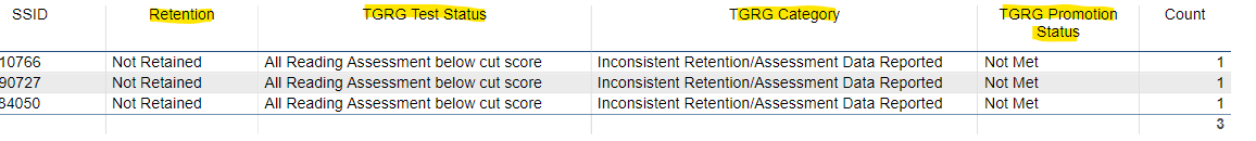 This will generate a list of students that you have not added a retention/non-retention for (an example is below)