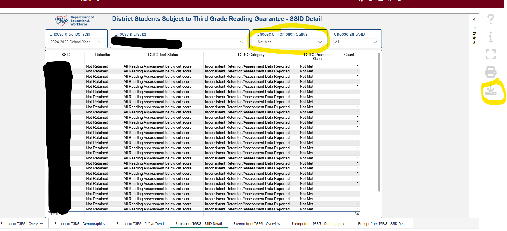 When that page opens up change the Choose a Promotion Status to Not Met and this will generate a list of SSIDs who did meet the proficiency level and ODEW is expecting to see promotion/retention options listed for them. You can export this report with the down arrow that I circled..