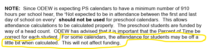 Some districts have noticed that from their calendar display total for their pre-school hours is off a little bit. You should take this total and multiply it by your percent of time for your pre-school students and this should get you close to the number of hours that your pre-school students are in attendance. The below statement is from the S Checklist when setting up Pre-school sub-calendars. The percent of time used should be what the students are actually attending as this will allow the attendance hours to be more accurate. Remember, pre-school funding is based off of head count so the percent of time has nothing to do with funding.