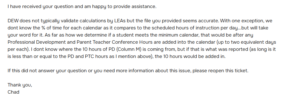 One ITC asked if ODEW would confirm the hours and percent of time were calculating correctly and if values in column J or N would be used to determine if the students are below the minimum hour required and here is the reply from ODEW: