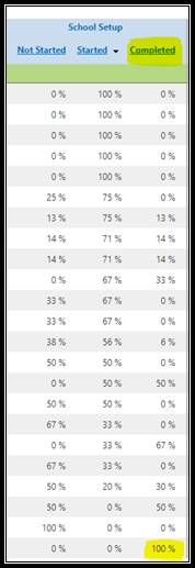 Once you have taken these steps, you will show 100% in the Completed column of the School Setup portion of your dashboard (shown below).
