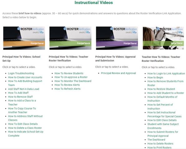 Further down on this page (https://www.ohio-k12.help/rosterv/learning-center/), you will see 5 minute instructional videos by task.