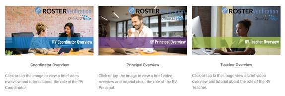There are several tutorials for all RV Participants that you may find extremely beneficial. To access the quick reference videos, simply click the following icon on the www.ohio-k12.help/rosterv<http://www.ohio-k12.help/rosterv> page: