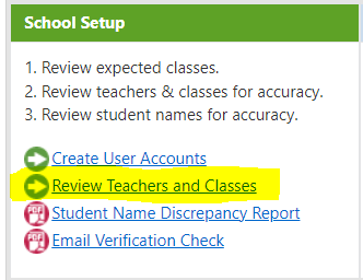 We are just beyond the mid-way point of the School Setup period. After you have reviewed teachers and classes for your building, be sure to click on the "Setup Complete" button to indicate that you have reviewed the initial information that was loaded for Roster Verification. You will still be able to make any necessary changes even after completing the setup. This button is located on your "Review Teachers and Classes" link in the School Setup box.