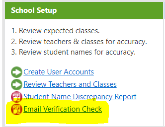 The window for Teachers to verify their rosters begins on April 12th. Notification for the teachers will begin shortly. Ability to receive notifications is dependent on their email address being listed inside of the Link Application. Districts can run the Email Verification Check to verify that teacher email addresses are correct. This report is listed under School Setup box.