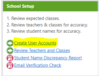 You may add the email for any teacher missing an email address, by selecting the Create User Accounts link located in the School Setup box.