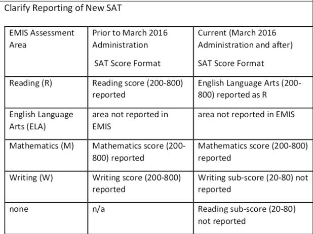Below is a chart that explains how the SATs for the March 2016 administration and beyond will be reported. The New tests will come with an ELA score which will be reported as Reading. There will be a Math score which is reported as before and it will come with sub scores for Writing and Reading that will not be reported. There will be more clarification once the manual comes out.