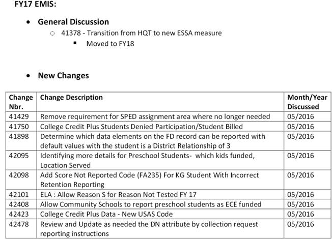 I wanted to let you know what was discussed on the EMIS change call this morning. The Complete agenda can be found at http://education.ohio.gov/Topics/Data/EMIS/Technical-Documentation/EMIS-Change-Committee-Conference-Calls
