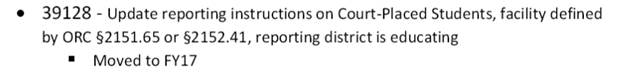41750- Districts will need to start keeping track of students that were denied CCP due to not applying prior to the deadline and students that are billed for their CCP classes due to failure of the course or dropping after the drop date. Since this will be required for FY17, and the process for applying for CCP is happening now, you will need to keep a list of those students denied for FY17 reporting. Once we are into FY17 you will need to keep a list of those students that you bill for courses. At this time, ODE is looking at it being a number of students reported on a DN record.