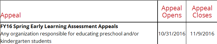 The Spring Early Learning Data Appeal Window opened today and will run through 11/9. They list it for PS or KG students, but KG students were not submitted in the Spring.