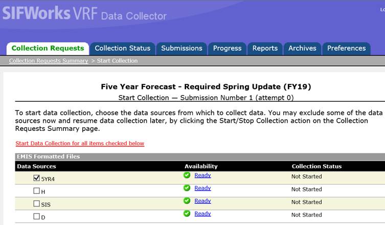 2. Start the collection selecting under Data Sources 5YR4 and click the Start Data Collection for all items checked below.