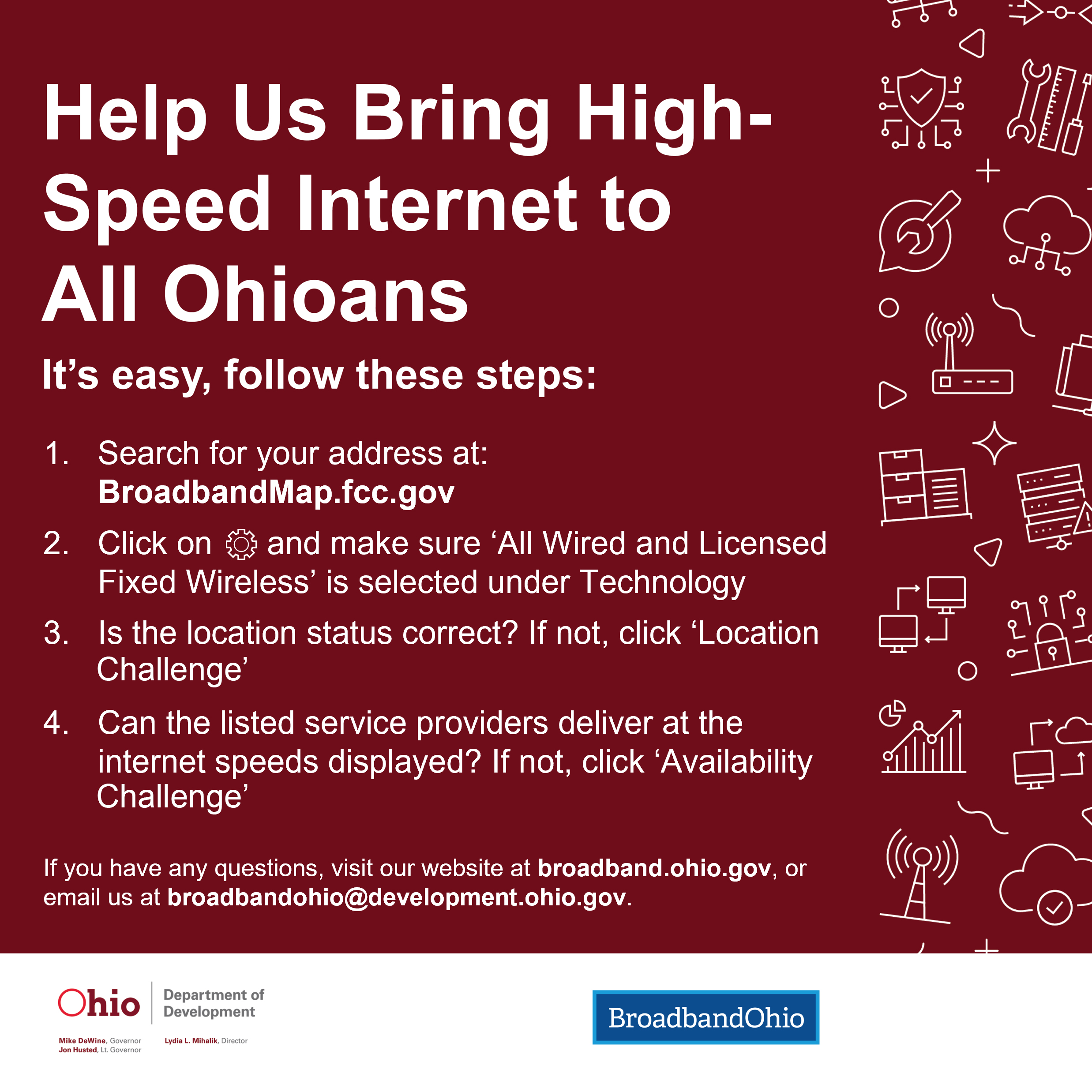 We want to improve newly released federal maps showing internet availability and speed in Ohio. From now through Jan. 13, 2023, you can help provide crucial feedback to the federal government that will ensure Ohio receives as much support as possible to expand high-speed internet.