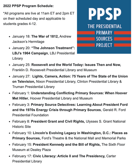 We are excited to share the 2022 Presidential Primary Sources Project (PPSP) program series and encourage you to take advantage of this wonderful opportunity.