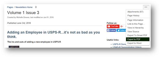 The June edition of the SSDT newsletter is available. Please click on the following link https://wiki.ssdt-ohio.org/x/04JHAg to access it. Our focus for the June edition is "Processes in the Redesign".. detailing the process of "Adding an Employee" in USPS-R and the "Expenditure Process" in USAS-R. If you would like to print off a copy of the newsletter, please click on the [cid:image007.jpg at 01D1BDAF.E1932B60] located on the right side of the newsletter and select "Export to PDF" to generate a PDF version.