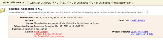 I just logged in to the data collector and ran the attached report of districts that have not submitted 19H data. The 19H manifest expires on 8/30. All data elements, excluding capital assets must be reported by 8/30. A new manifest will open in September for capital assets.