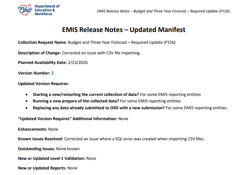 Please refer to the Release Notes<https://links-1.govdelivery.com/CL0/http:%2F%2Feducation.ohio.gov%2FTopics%2FData%2FEMIS%2FTechnical-Documentation%2FEMIS-Release-Notes/1/0100019c1e3ab227-4e6c6da7-fd32-4c92-924b-3b423067336a-000000/c9a8SVT_jnXl06K3XPouaG5OuQ4sFBW9FEFJWtsCUMk=442> for details regarding this newly posted collection request.