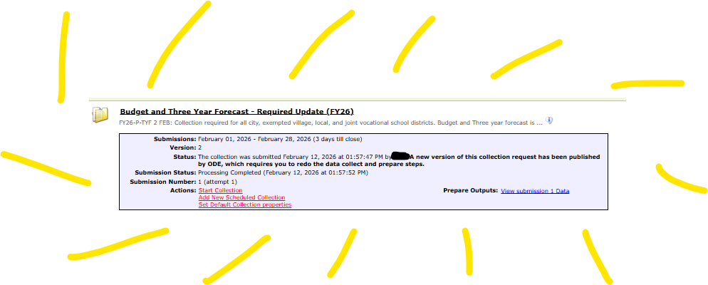If your district has the following message under the forecast submission you do need to start at step 9 on the attached instructions and re-submit (Note: you do not have to re-upload the files as those are still in the data collector in other sources and it will pick up the last one loaded).