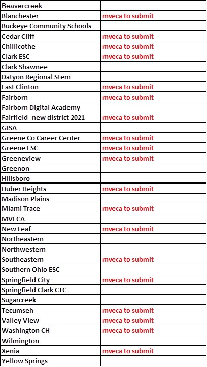 Below is a listing of our districts and those that have reached out and confirmed they need us to file on their behalf are listed with "mveca to submit" in red text. If you need us to submit your files we MUST hear from you if you are not notated as "mveca to submit" by this Friday 1/21/2022 as we will be filing the forms on Monday 1/24/2022. We only need to hear from districts that needs us to file on their behalf but are not listed as so on the list below. Please reply to this email if you fit this condition.