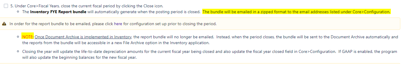 I have included a NOTE in the checklist stating once the Document Management and Archival (aka Document Archive) is implemented in Inventory, when closing the period, the bundle will instead be sent to the Document Archive automatically and the reports will be accessible via a new File Archive option in Inventory.