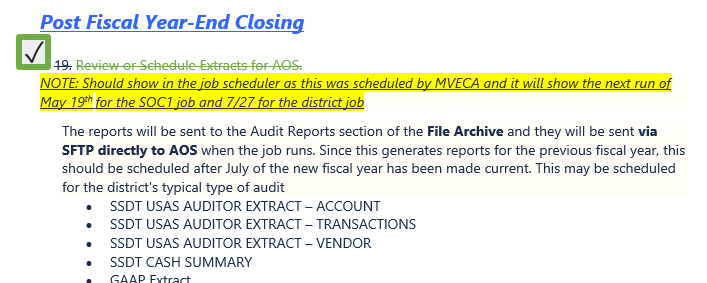 I have verified for every district both jobs are set up so there is nothing for you to complete for this step (19). I did request a USAS enhancement so that any user with a manager role would be able to see any job scheduled for the district. Note: This enhancement request does not impact the job and we assure you all of this has been completed and doubled checked in USAS for all districts so you do not need to do anything more for step 19 on the FYE USAS closing.