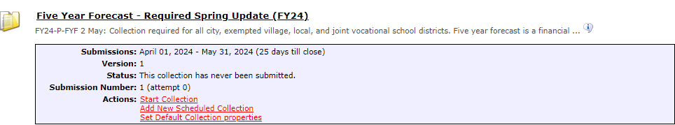 This is a reminder the 5 year forecast required Spring update is due by 5/31/2024. MVECA will convert the CSV files and upload the sequential files to the data collector for our districts. If you need us to convert your file please send a ticket/email to helpfiscal at mveca.org<mailto:helpfiscal at mveca.org>