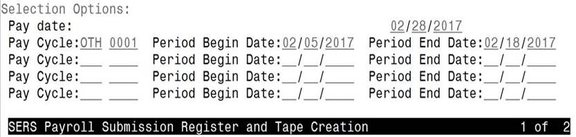 When running the SERSREG report, the "Pay Cycle" code should match the code you have in eSERS from when you created your payroll cycle schedule. If you have .seq files already created with the incorrect cycle code, the only way to fix it now is to transfer the file out of the payroll system, then open it in the Notepad program and edit that top line to include the correct cycle code. Please see the example below that shows where the cycle code is entered when going into SERSREG.