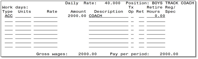 Please see the example below, a job is marked "Y" to equal pays and on the DEF calendar, the system will automatically insert "ACC" as the pay type into future or current pay. Therefore, no service hours or days can be populated on the report: