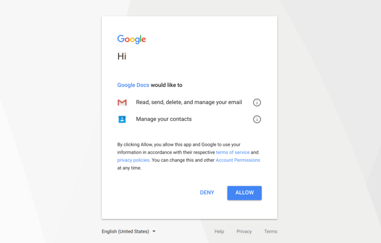 3) Once logged in, this is where the attack happened. Users were asked to allow "Google Docs" permission to access their Google account. So, a malicious person created an application that used Google as a single sign on, but they named the application "Google Docs" to fool users into thinking it was an actual Google application.