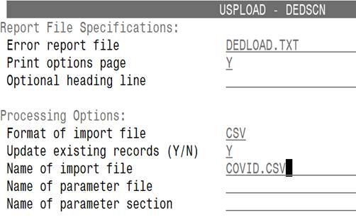 1. Attached is a spreadsheet with the needed fields for importing the values into the COVID fields on the federal deduction record, 001. The leading zeros are required. Use USPLOAD/DEDSCN to do the import to the deductions