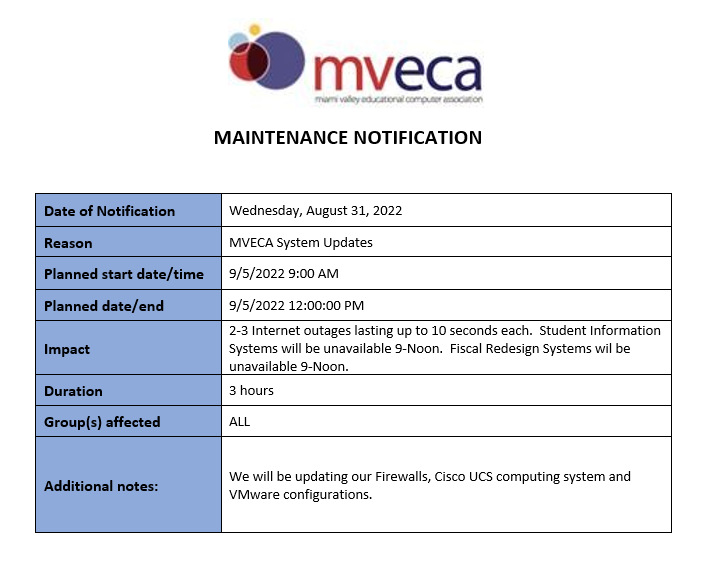 Subject: MVECA maintenance window 9/5/22