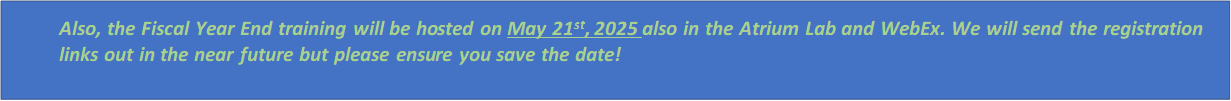 [Also, the Fiscal Year End training will be hosted on May 21st, 2025 also in the Atrium Lab and WebEx. We will send the registration links out in the near future but please ensure you save the date!]