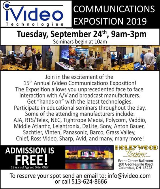 iVideo's Communications Expo is a little under six weeks away. I wanted to be sure that you received my personal invitation. We have spoken on the phone a couple of times. Those who attended the show in 2018 you know that the iVideo Communications Exposition is the place to see emerging technologies in both the commercial A/V and the broadcast/HOW/production industries.