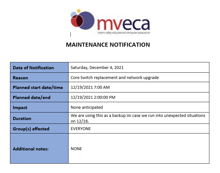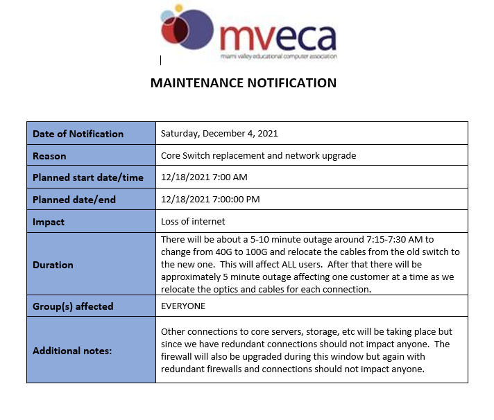 [Tech-l] MVECA Maintenance 12/18 and 12/19